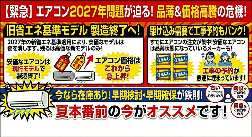 エアコン2027年問題ご存知ですか?! お早めのご検討をお勧めします 投稿日 2026年4月15日 著者 fukutake カテゴリー ブログ 早ければ今秋頃から、省エネ基準強化・価格上昇した「2027年製」が発売開始予定です。エアコンの価格を抑えたい方は、「2026年製」が購入できる「今」がオススメです! Screenshot この記事を書いた人 fukutake 記事一覧